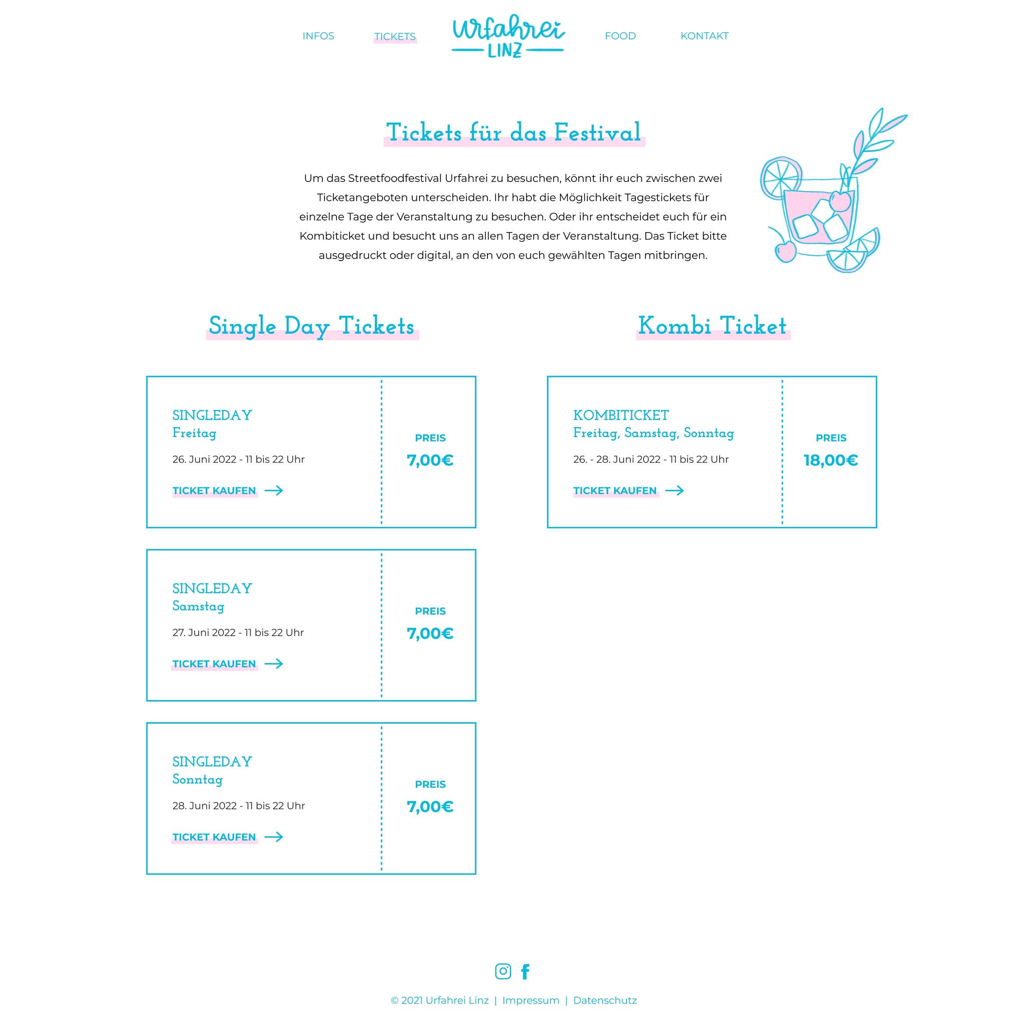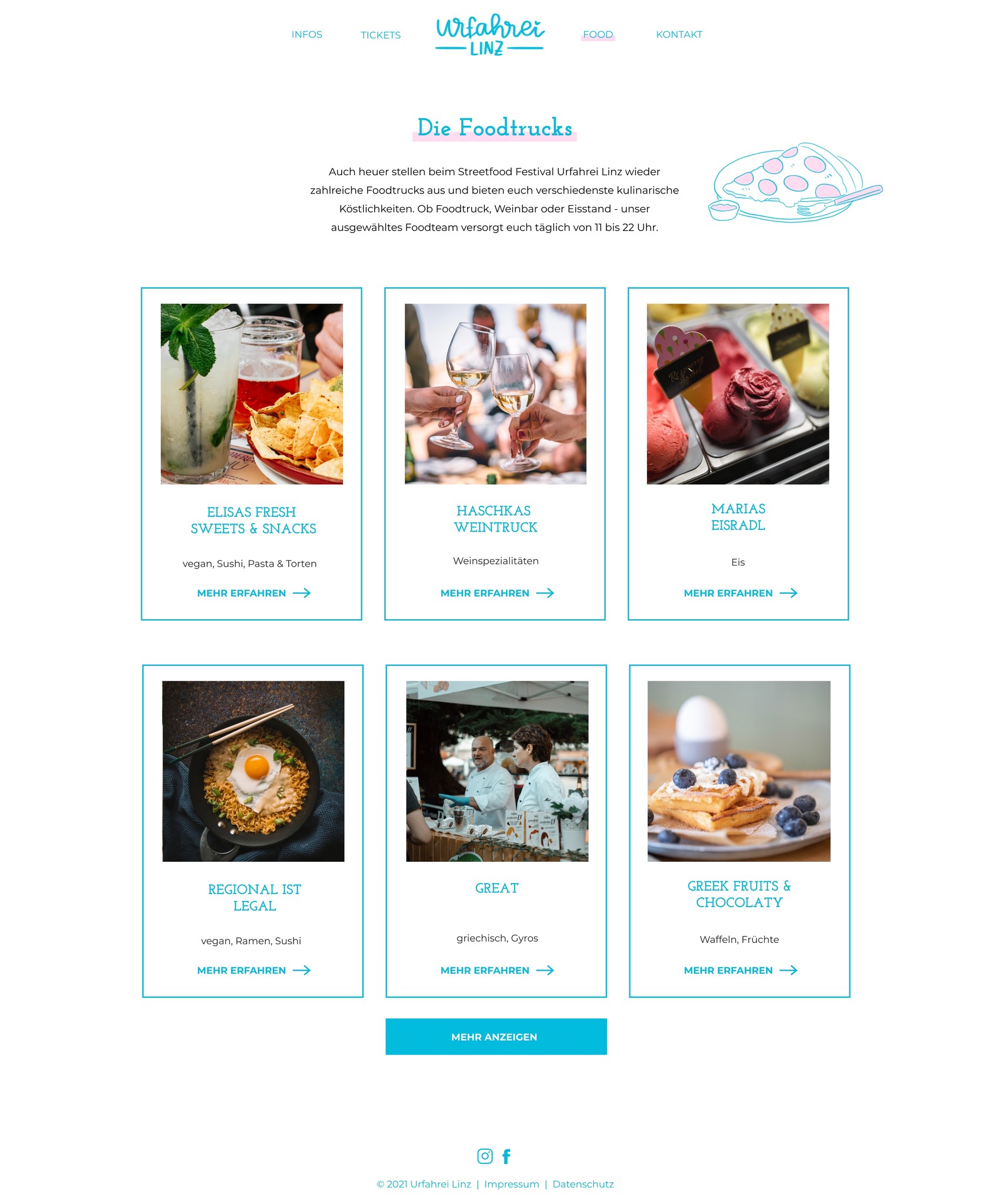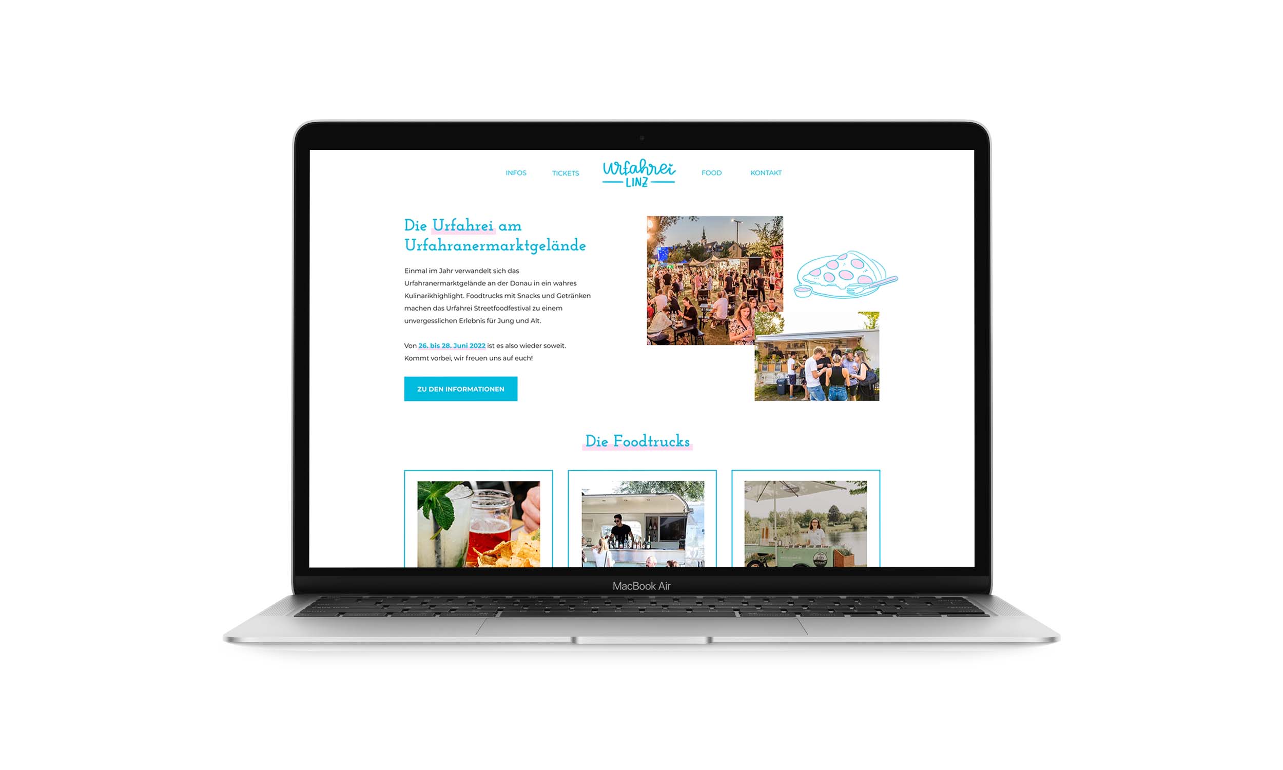Für die Urfahrei Linz habe ich ein fiktives Logo und eine Webseite sowie Illustrationen und ein allgemeines visuelles Konzept entworfen. Die hellen, frischen Farben und die handgeschriebene Typografie repräsentieren das Streetfood-Festival. Die Illustrationen unterstützen die Bilder und erwecken das Design zum Leben.